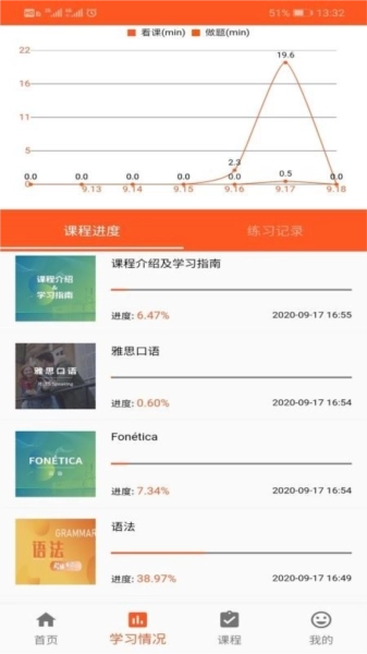 3、进入学习情况版块,查看课程学习进度与练习记录,从而了解自身的学习情况。