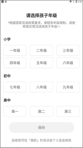 1、先注册并登录软件,在正式开始使用前,请先选择孩子对应的年级。