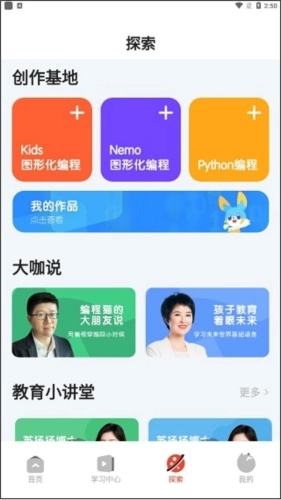 4、在“探索”区域,设有编创活动、创作基地,还有漫画、小剧场、教育小讲堂、童话故事、成长动画等内容。
