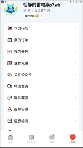 5、我的”页面即个人中心,这里可以进行学习作品的创建与课程管理,还能查看我的订单、我的券包以及课程兑换等优惠福利内容。要是在使用过程中遇到任何问题,也能在此联系客服。