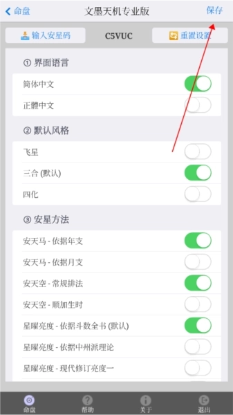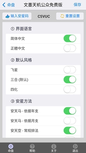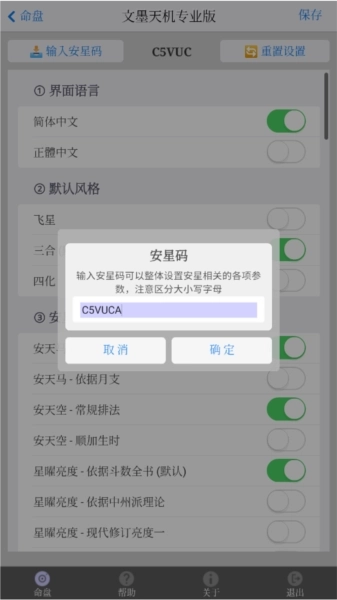 2、点击“输入安星码”选项,界面中间红圈标注的内容即为安星码;若输入其他已预先设置完成的安星码,系统便会生成与之完全一致的排盘结果。