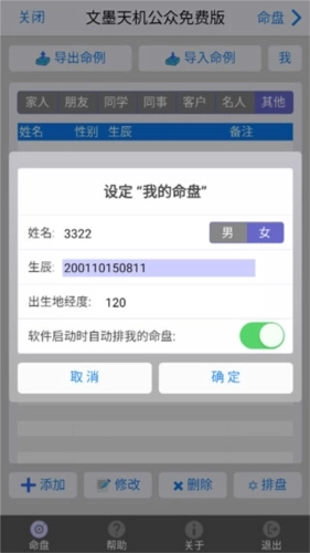 3、录入个人的性别、生辰、出生地经度等排盘所需信息,完成“我的命盘”设置。生辰时间需以12位数字格式填写,具体结构为四位“年”、两位“月”、两位“日”、两位“时”、两位“分”,比如2001年6月8日6点08分,应录入为200106080608。出生地经度则根据自身实际出生地的经度数值如实填写即可。