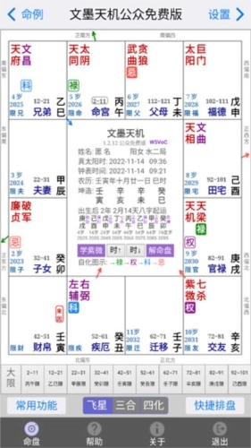 文墨天机公众免费版是高新区文墨天机软件开发工作室匠心打造的手机算命占卜应用,专为热爱易学的学者与爱好者设计,在紫微斗数领域特色鲜明。它汇集多流派紫微斗数内容,提供丰富全面的星耀组合及排盘功能,用户能依据自身需求自主排盘,深入知晓各方面情况,且最重要的是,任何人都可免费使用。