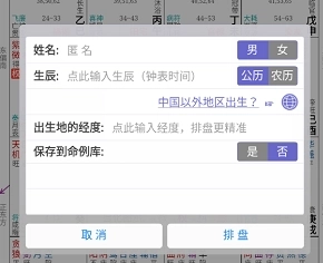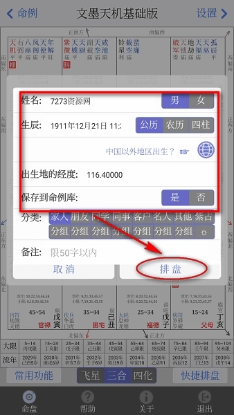 2.接着填写姓名、生辰以及出生地的经度,之后点击“排盘”按钮。