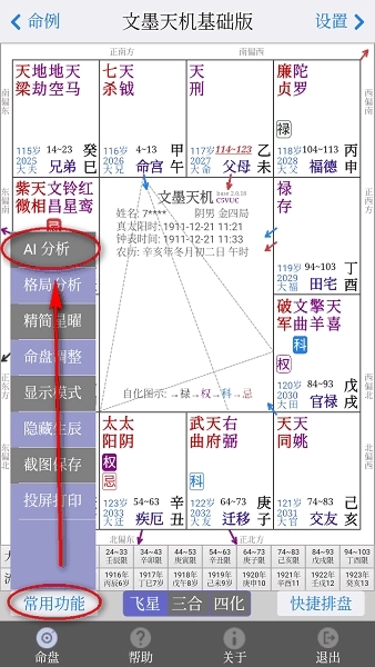4.也可以点击左下角的“常用功能”,选择“AI分析”选项,以此来对命盘进行分析。