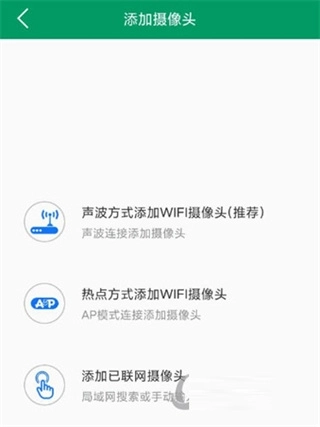 2、挑选添加途径,声波添加WiFi摄像头(建议使用)、热点添加WiFi摄像头、添加已连接网络的摄像头。
