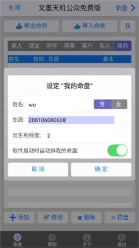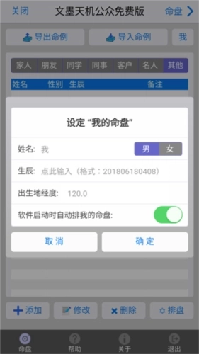 3、填写个人的性别、生辰、出生地经度等排盘所需信息,完成“我的命盘”设置。生辰时间需录入12位数字,具体格式为四位年份、两位月份、两位日期、两位小时、两位分钟,比如2001年6月8日6点08分,应录入为200106080608。出生地经度根据自身实际出生地的经度数值如实填写即可。