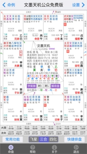 3.配备精心打造的排盘界面,风格简约却不失深度,既契合命理师的专业操作习惯,也贴合紫微斗数爱好者的使用偏好;盘面的布局逻辑与配色体系,均与市面上主流的飞星、三合、四化排盘软件相统一,能有效降低用户的上手难度。