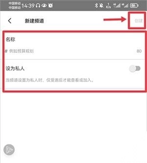然后在创建频道中将名称设置完成后点击创建即可