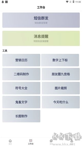 点击进入工作台后,用户既能借助该功能群发短信,还能使用平台提供的各类工具。