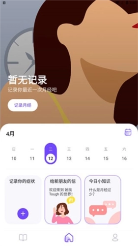 4、首页设有月经记录、症状记录功能,还有一封致新朋友的信——欢迎来到她扶Tough的世界。今日小知识:什么是月经过少?