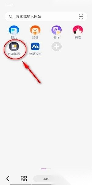 启动可拓浏览器后,在初始页面找到“必备拓展”选项并点击,随后查看图片中箭头所指向的位置。