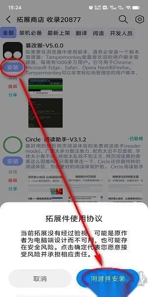 进入“拓展商店”后,挑选需要使用的插件,点击“安装”按钮,待弹出提示窗口时,点击“同意并安装”选项即可。
