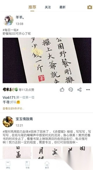 进入动态页面,能浏览其他用户分享的书法临帖作品,方便大家彼此交流借鉴。