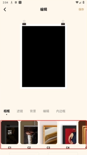 5、这里有着相框、滤镜、背景、编辑、内边框让你选择使用,编辑完成后即可保存了。