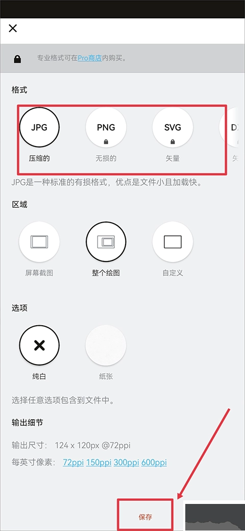 接下来在导出界面里挑选你想导出的格式,再点击保存,就能把绘制好的作品导出到手机里了。