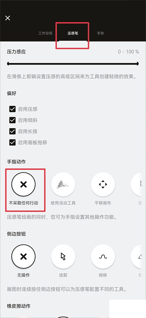 在压感笔的相关设置界面里,找到对应手指操作的选项区域,从中选择“无响应”或类似不触发任何功能的选项,就能完成关闭操作。