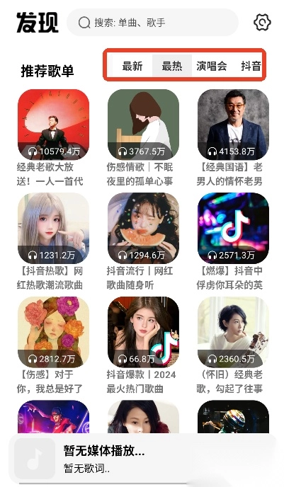 而且软件里还设有演唱会、抖音、最新、最热等歌单分类,用户可以自由切换。