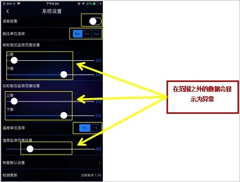 3、界面异常:如有温度数据、胎压数据胎压图标、文字提示为红色或有语音提示皆是异常现象;