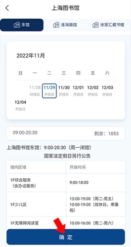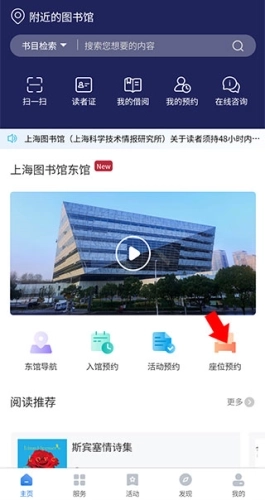 1、并打开上海图书馆,注册或登录我们的账号后,在首页点击入馆预约按钮