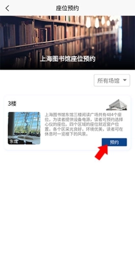 2、来到座位预约界面后,找到想要预约座位的图书馆,并点击右下角的预约按钮