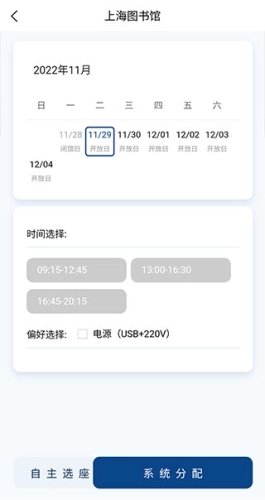 3、之后来到下方界面,我们选择想要预约的日期时间以及是否需要电源等,并点击下方的自主选座或者系统分配即可