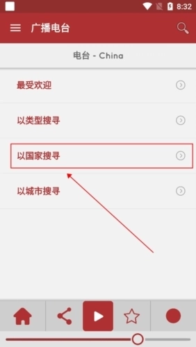 2、接着就会弹出许多的功能,但是如果想要切换国家,就需要点击【广播电台】;