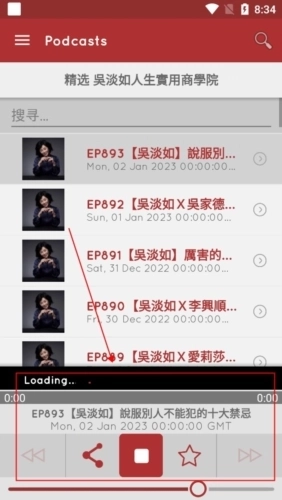 2、寻找到喜欢的播客之后,点击进入会有许多的内容供你选择,接着点击想要收听的集数;