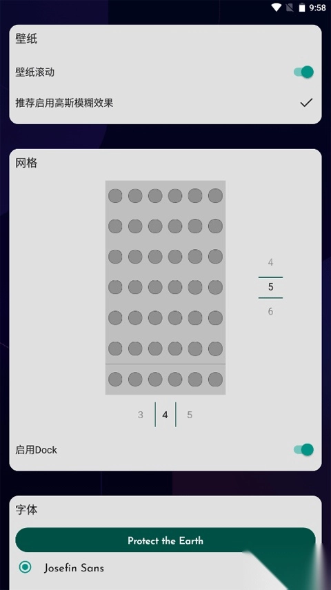1、打开,设置壁纸滚动、高斯模糊效果,网格形式以及字体等,点击右下角的“√”;