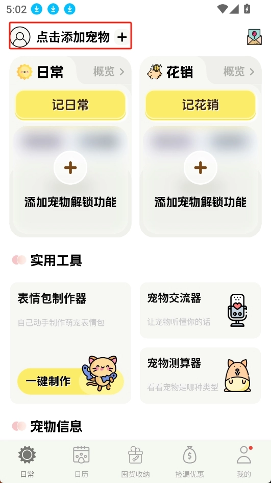 进入主页后点击左上角添加宠物信息,如图所示: