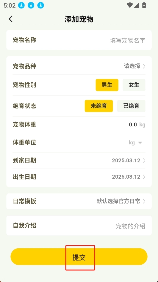 根据实际情况填写宠物信息,完成后点击提交