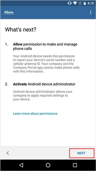 允许公司门户进行电话拨打与管理操作:该权限可让设备向组织的设备管理服务商Intune分享其国际移动设备识别码(IMEI)。授予此权限不存在安全风险,Microsoft绝对不会实际进行电话拨打或管理行为。
