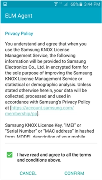 如果你使用的是SamsungKnox设备,系统会提示你先查看并确认ELM代理隐私策略。