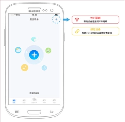 第一步:依据说明书指引让设备进入可联网状态,接着按照设备发出的语音提示进入对应的设备页面,随后点击页面右上角的【+】号,从中选择设备上网相关按键,以此完成设备联网状态的进入操作。