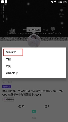 红蓝cp可以取消欣赏其他用户,不清楚的用户请参考以下操作。