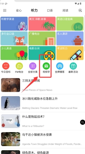 3、然后是听力页面,用户可以在这里选择自己喜欢的类别进行收听,这些类别包括听歌学英语、美文诗歌故事、英语口语宝典、多行业口语、名人演讲、少儿英语、电影台词、考试听力,下方还有今日目标、全部分类、视频学、金牌播客、最新活动以及一些新闻资讯。