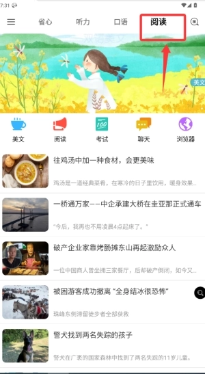 4、最后是阅读页面,最上方图片是推荐阅读的美文入口,点击即可进入,紧接着是阅读分类,它们包括了美文、阅读、考试、聊天、浏览器这5大类别,再下面则是最近一些时事新闻,通过浏览这些可以有效提高用户的英语阅读水平。