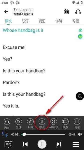 点击进入课本以后,头部导航条有原文、双语、词汇、详解、习题等,下面有英音、复述、听写、跟读、AB复读、顺序、调速等,点击“跟读”;