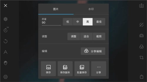 质量:泼辣修图在导出时支持将质量设置为低、中、高、最佳四个档次,输出质量越高图像的整体质量(清晰度、色彩、细节等)就会越高,但图片体积也会越大。