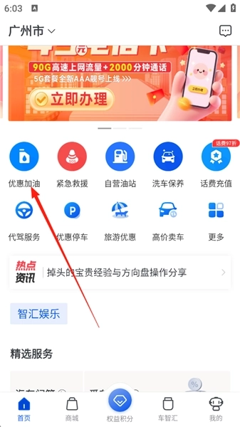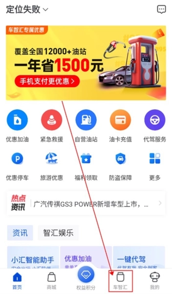1、首先打开应用,其首页配备了优惠加油、紧急救援、代驾服务等功能;
