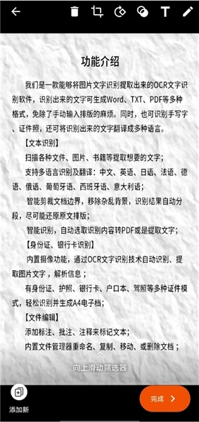 2、接着进入图片编辑界面,你可以左右滑动图片来浏览文档内容,在确认文档清晰且文字完整后,点击右下角的“完成”按钮即可。