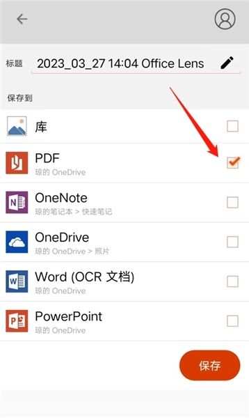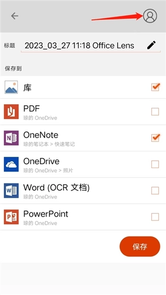 4、接下来,你可以在此处修改标题,还能选择将内容保存到库、PDF、OneNote、Word(OCR文档)、OneDrive以及PowerPoint中。这是一种支持多选的格式,你能够同时保存到多个位置。不过要注意,记得先点击右上角的头像完成登录操作。
