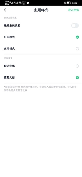 3、界面右上角设有“导入字体”按钮,点击该按钮即可进入字体管理器界面;在管理器中选择需要添加的字体文件(目前仅支持ttf格式),完成添加后,可在字体设置列表中查看已导入的字体。
