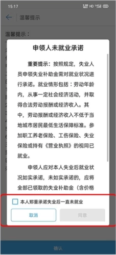 3、申领人需做出未就业承诺,阅读相关内容后勾选“√”,表示同意即可进入下一步操作。