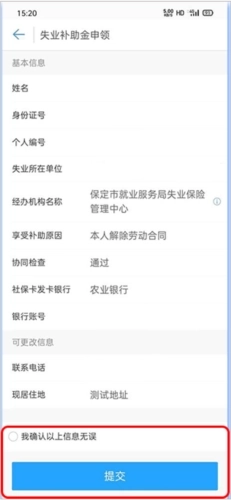 4、对于承诺未就业的人员,将进入申领审核环节。需查看个人申领信息,确认信息无误后点击【提交】按钮。