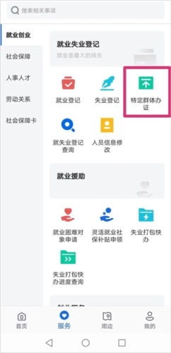 ②、进入就业创业模块后,选择就业登记、失业登记或特定群体办证中的一种作为自己要申请的登记类型。