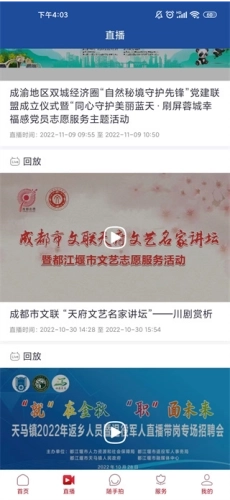 3、进入“直播”页面,即可观看该地区的各类直播赛事、主题活动、名家讲坛等内容。