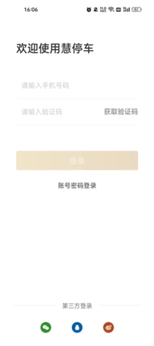 1、首先安装慧停车,输入手机号验证码登录,软件支持微信、qq、微博登录;