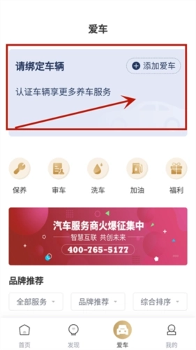 5、在爱车栏可以绑定自己的车辆,认证车辆可以享受更多的养车服务。
