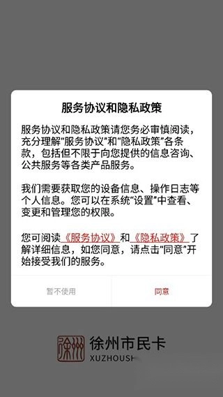 请安装kk站提供的徐州市民卡应用。首次使用前,请先阅读并同意用户协议。